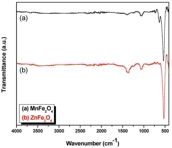 Fourier transform infrared (FT-IR) spectra of Mn1−xZnxFe2O4 NPs for (a) MnFe2O4; and (b) ZnFe2O4.