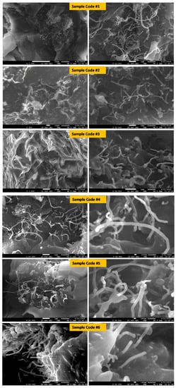 SEM images of the nano-structured specimens are shown in Figure 6, which demonstrates the dispersion of MWCNTs particles and MnFe2O4 NPs as well as ZnFe2O4 NPs. The fillers were dispersed randomly in the host matrix. In addition, it is clearly seen that some of MWCNTs were coated/filled with MZF NPs. This result agrees with the XRD results, where the absence of any additional peaks implies that MWCNTs were coated with spinel ferrite nanoparticles.