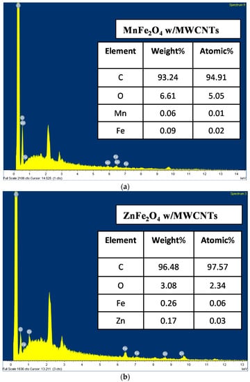 The EDX technique provides the effective atomic concentration of different components in the top surface layers of solids. The energy dispersive X-ray (EDX) analysis of the specimens, as shown in Figure 7, was carried out to confirm the elemental composition of the specimens. The EDX spectrum confirms the presence of Mn, Fe, C, and O elementals, as well as Zn, Fe, C, and O elementals for the samples of MnFe2O4 with MWCNTs and ZnFe2O4 with MWCNTs, respectively. The other minor peaks might be due to the impurities in the starting materials. The relative atomic and weight abundance of Mn, Zn, Fe, and O species are presented in the tables on each EDX graph. The atomic ratios of Fe/Mn and Fe/Zn, found to be 2:1 by EDX analyses, confirmed the presence of MnFe2O4 and ZnFe2O4 nanoparticles on the MWCNT surfaces.