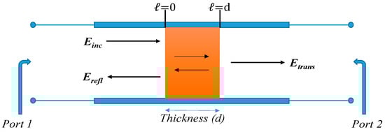 where λ0 is the wavelength of free-space; λc is the cut-off wavelength of the transmission line. The schematic illustration of microwaves transmitting through, and reflecting from, a sample in a waveguide transmission line is represented in Figure 8.