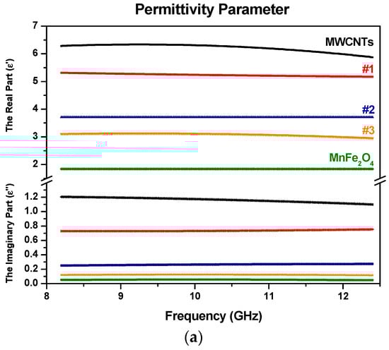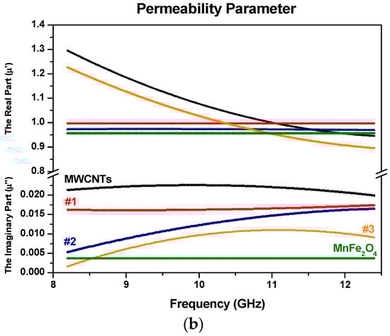 Electromagnetic constitutive parameters with (a) the real and imaginary part of permittivity for MWCNTs with MnFe2O4 samples; and (b) the real and imaginary part of permeability for MWCNTs with MnFe2O4 samples (samples are color-coded).