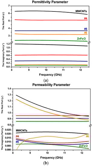 Electromagnetic constitutive parameters with (a) the real and imaginary part of permittivity for MWCNTs with ZnFe2O4 samples; (b) the real and imaginary part of permeability for MWCNTs with ZnFe2O4 samples (samples are color-coded).
