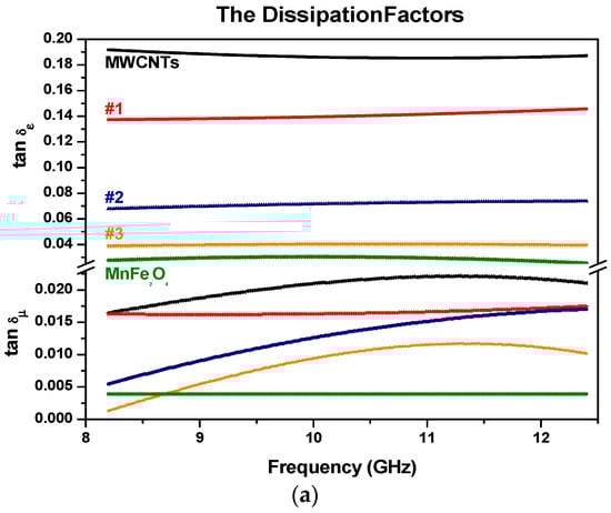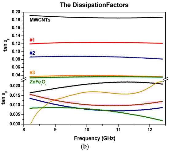 The dielectric (tan(δε) = εr″/εr′) and magnetic (tan(δµ) = µr″/µr′) dissipation factors are represented in Figure 11a,b. It is noted that the values of the magnetic dissipation factors are generally less than the dielectric dissipation factors for the MWCNTs with MnFe2O4 samples, which means that the absorption originates mainly from the dielectric characteristics of MWCNTs with MnFe2O4 and ZnFe2O4 nanoparticles rather than the magnetic characteristics.