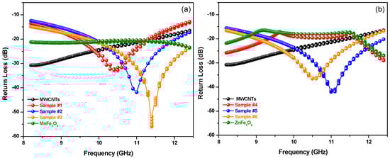Frequency dependence of the return loss (RL) of MWCNTs with MZF NPs alloys; (a) MWCNTs with MnFe2O4 samples; and (b) MWCNTs with ZnFe2O4 samples.