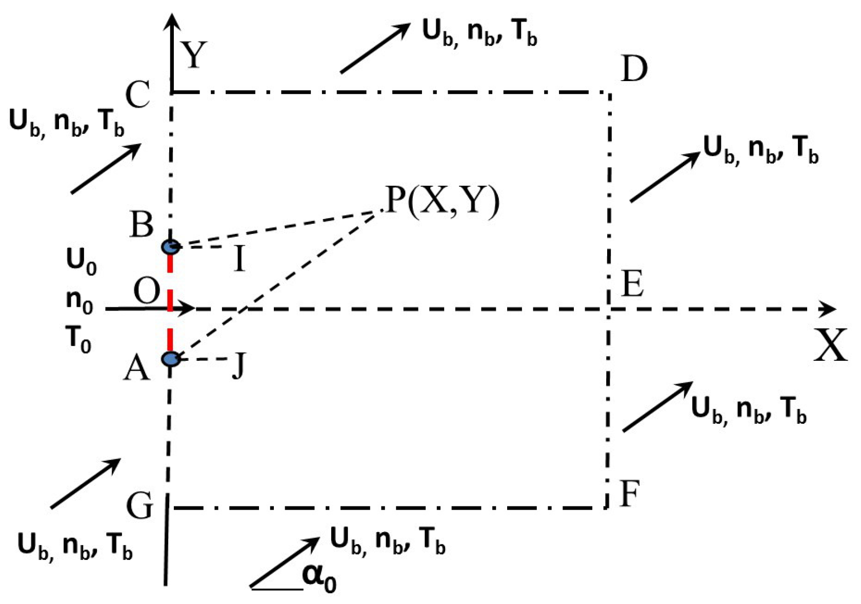 Figure 1 illustrates the problem. In general, combined plume and background gas flows are three-dimensional. A simpler two-dimensional flow model is presented in this paper to demonstrate the procedure; however, it can conveniently extend to a three-dimensional situation. The problem can be summarized as follows. A collisionless jet expands into a near-vacuum place with a uniform dilute background flow. The jet and background flows are assumed to be described by Maxwellian velocity distribution functions, characterized by two bulk number densities and , two bulk speeds and , two temperatures and , and the relative angle between these two flows defined as . The values for these seven parameters are assumed available. The nozzle exit is represented by segment in Figure 1. The background flow enters the simulation domain through , , , , and ; all the boundary edges except segment . The goal of this section is to obtain formulas for the final mixture properties, including density, velocity components, pressure, and temperature.