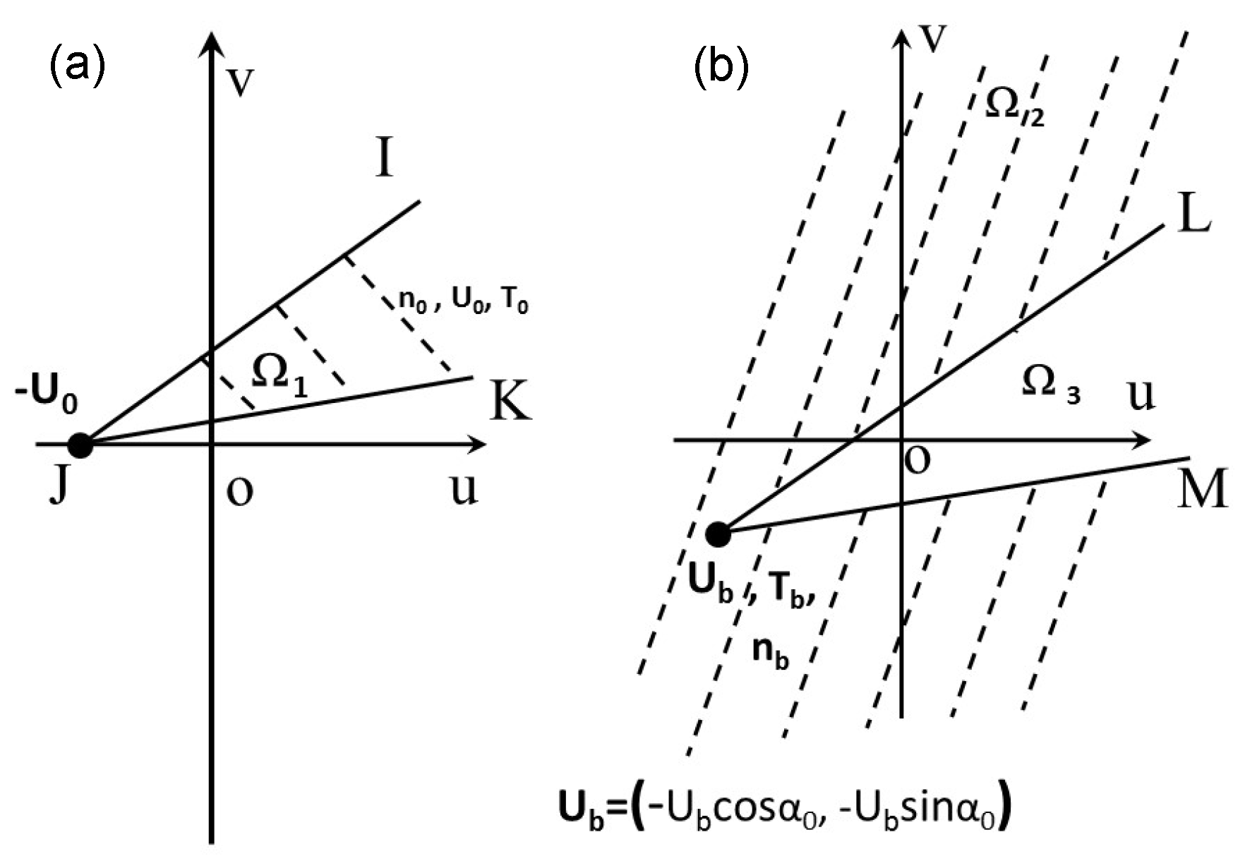 The purpose of this paper is to address this issue by developing new and unique models to analyze dilute background flow effects on dilute weak jet flows. In space engineering, a weak jet is usually dilute, and can create a very small force, but a large specific impulse. Gaskinetic theories can be used for analytic investigations on this type of jet flows. For the problem of a collisionless jet expanding into a vacuum, there are many theoretical investigations in the literature, and here only list a few. Narasimha [21] and Liepmann [22] presented expressions for collisionless jet density fields. Recently, more comprehensive results for collisionless jets into a vacuum and the corresponding impingement flows are obtained [23,24]. For vacuum pump effects, related pure theoretical work is rare. Cai [25] obtained the detailed collisionless local flow field patterns around an absorptive cryogenic plate. The mass flow conservation relation is also used to study the pump absorption coefficient effect, and can be considered as a full-scale model for the whole vacuum chamber. Several middle-scale gaskinetic models [26,27] were also developed involving multiple vacuum chamber sections, aiming to provide detailed background flow distributions.