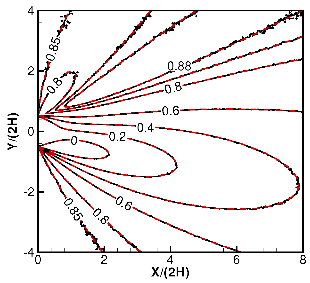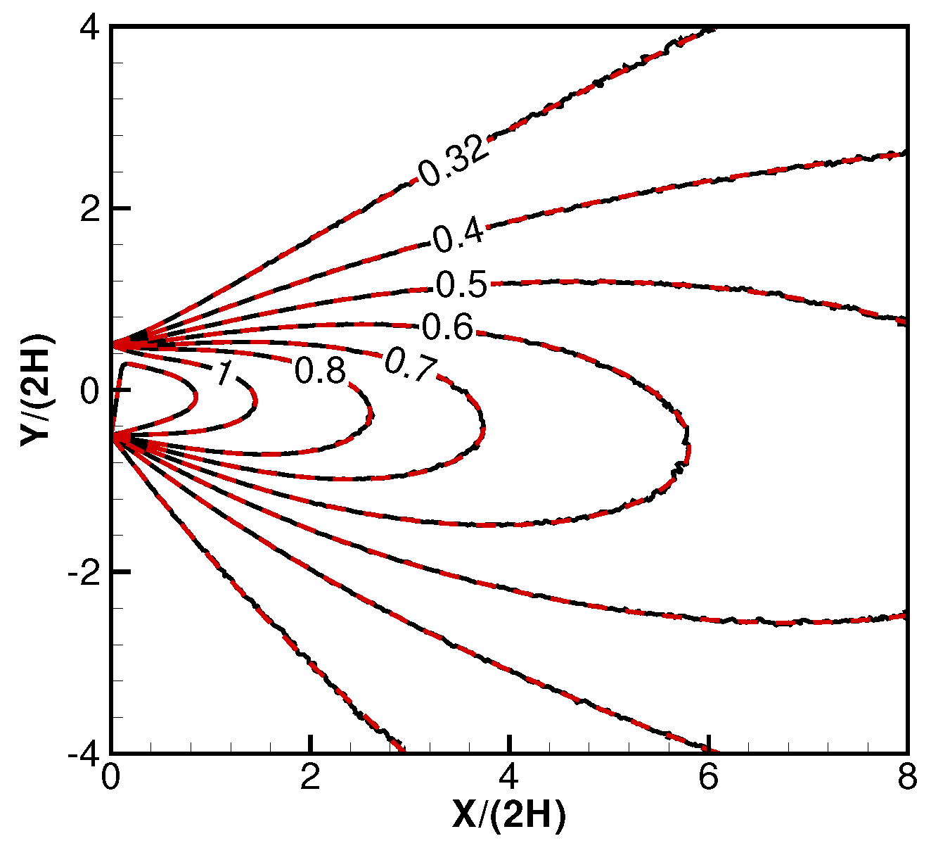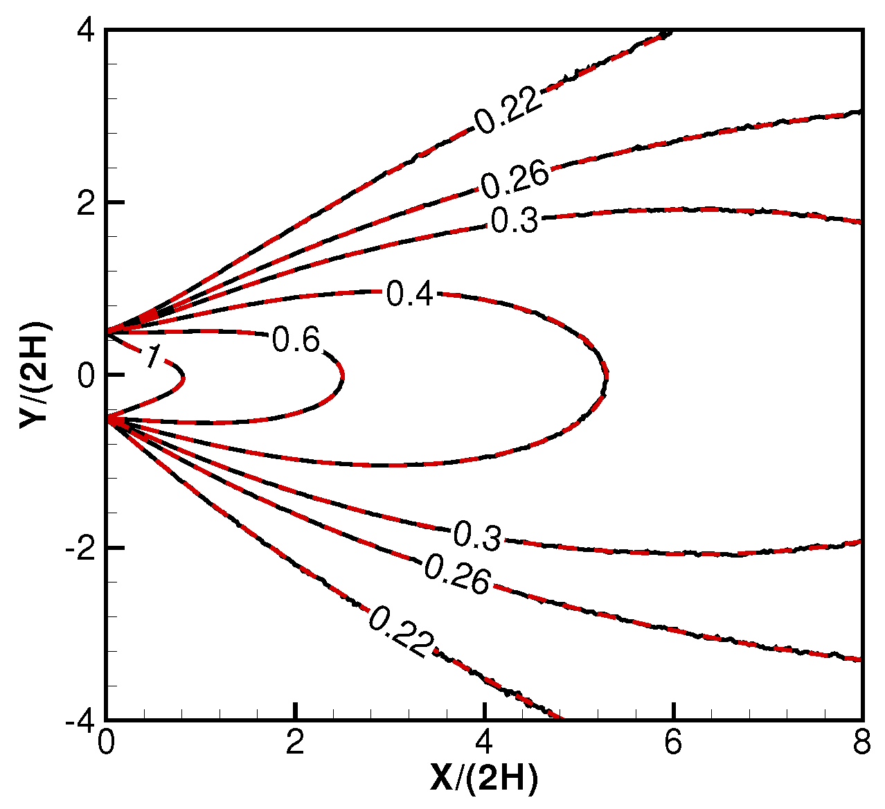 Nondimensional U-velocity component contours for the jet/background mixture, , , , , Kelvin, and Kelvin. Red: analytical, black: DSMC.