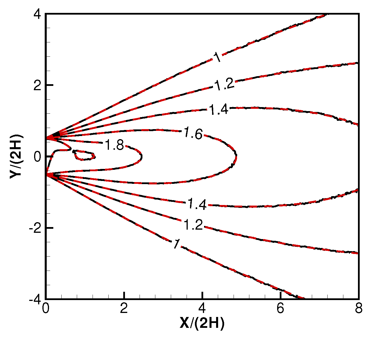 Figure 3 shows the normalized density contours, . The gradients around the exit are fairly large, and the two nozzle exit lips are singularity points where the density drops rapidly to the background density outside the nozzle. Figure 4 and Figure 5 show contours for normalized mixture velocity components, and , along the X- and Y-directions, respectively. Due to the background flows, the velocity contours, especially for the V-velocity component, are distorted. For the U-velocity component contours, the topology patterns change from the scenario of a collisionless jet expanding into a true vacuum, where the velocity continues to increase monotonically along the X-direction [23]. Figure 6 and Figure 7 are normalized temperature and pressure contours, and . The analytical and numerical simulation results are essentially identical, and the simulation results validate Equations (7)–(11), for the combined flowfield with jet and background flows. These validated formulas provide solid foundations for further discussions, and no extra simulations are needed.