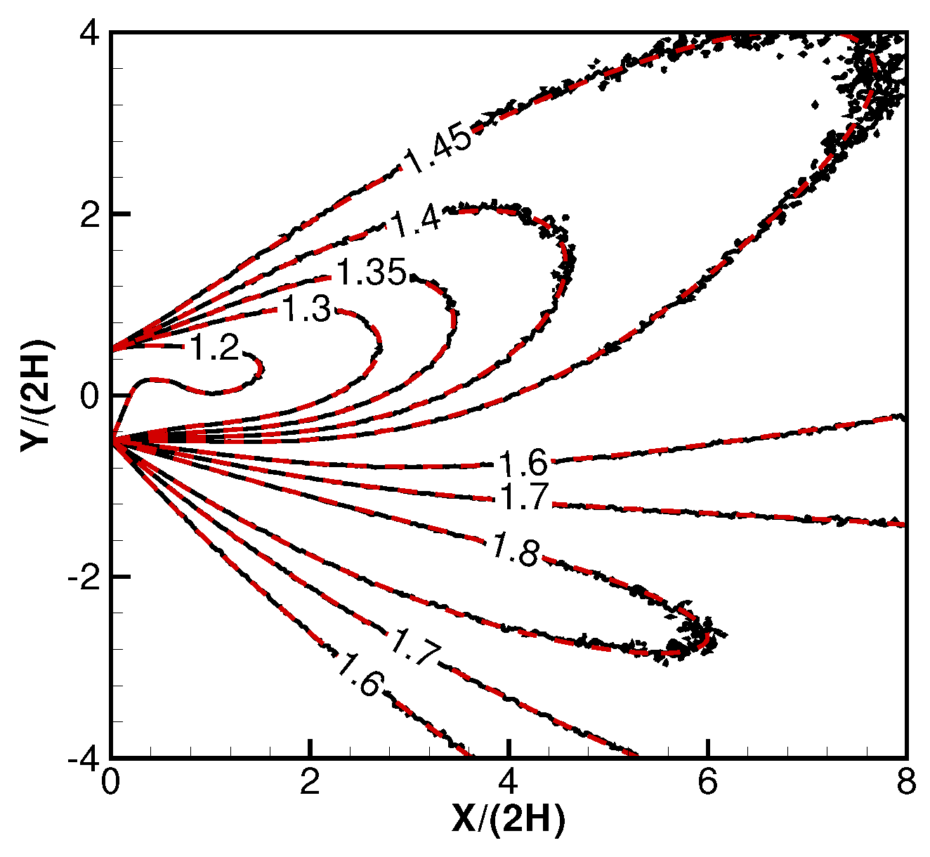 Nondimensional density contours for the jet/background mixture, , , , , Kelvin, and Kelvin. Red: analytical, black: direct simulation Monte Carlo (DSMC).