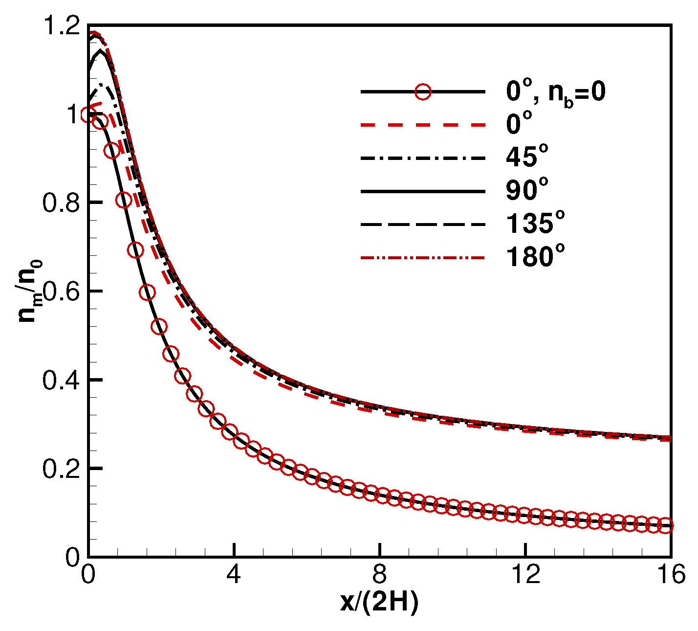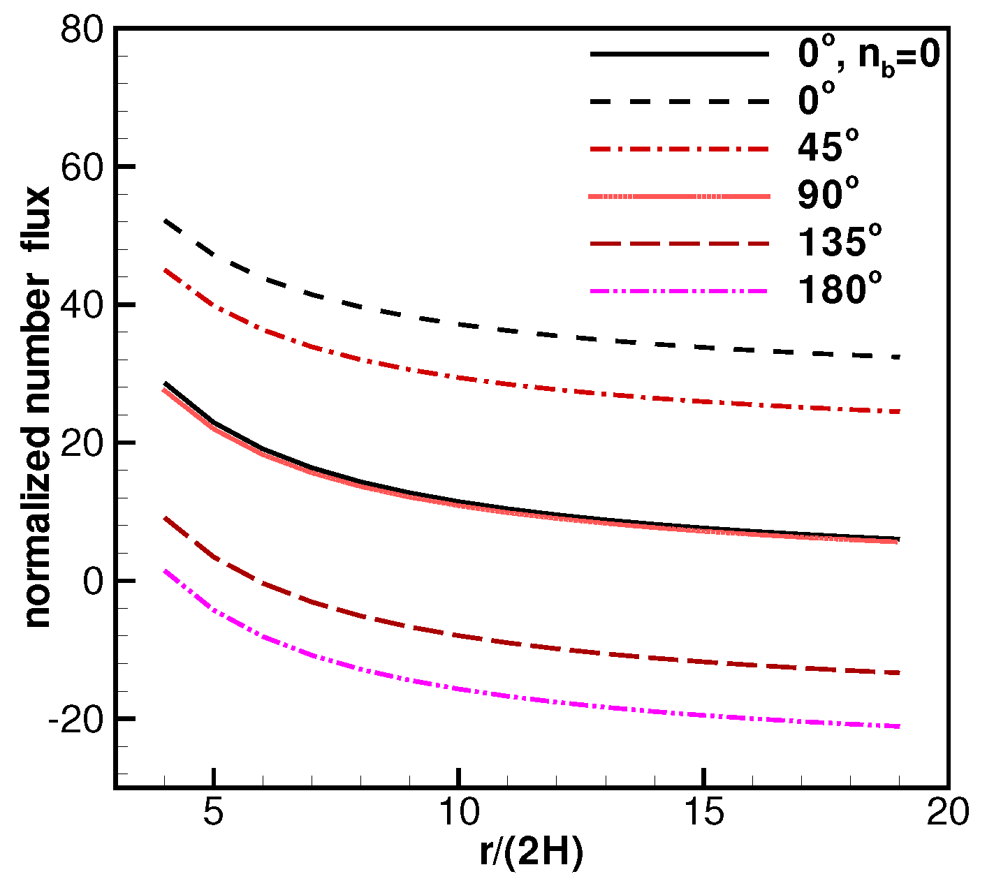 Usually, for jet flows inside vacuum chambers, a collisionless flow is a reasonable assumption due to the related low jet and background flow densities. At the farfield boundaries, the nozzle exit can be considered as a point source. It is generally accepted that there is a constant total number flux across an arc within the same angle span but of different radius. As shown in Figure 13, for the pure jet situation with , the integration results of mass flux over curves and shall be the same. This assumption is not always valid with a background flow. If there is a uniform background flow, e.g., assuming from left to right with , the background number flux through shall be larger than that through , because the former curve has a larger width. The total number fluxes through and shall be larger than that out of the nozzle exit. By comparison, if the background flow is from right to left with , then a portion of jet flux is “canceled” by the background flows. The measured total number flux across curve shall be smaller than that across , and both are smaller than that out of the nozzle. Figure 14 shows the integrated total number flux with different radii, within an angle span of . For the scenario of a pure jet into a true vacuum, , the total number flux conservation relation holds. For the situation that the background flow is not perpendicular to the jet flow, the number flux curve is shifted from the pure jet flow case.