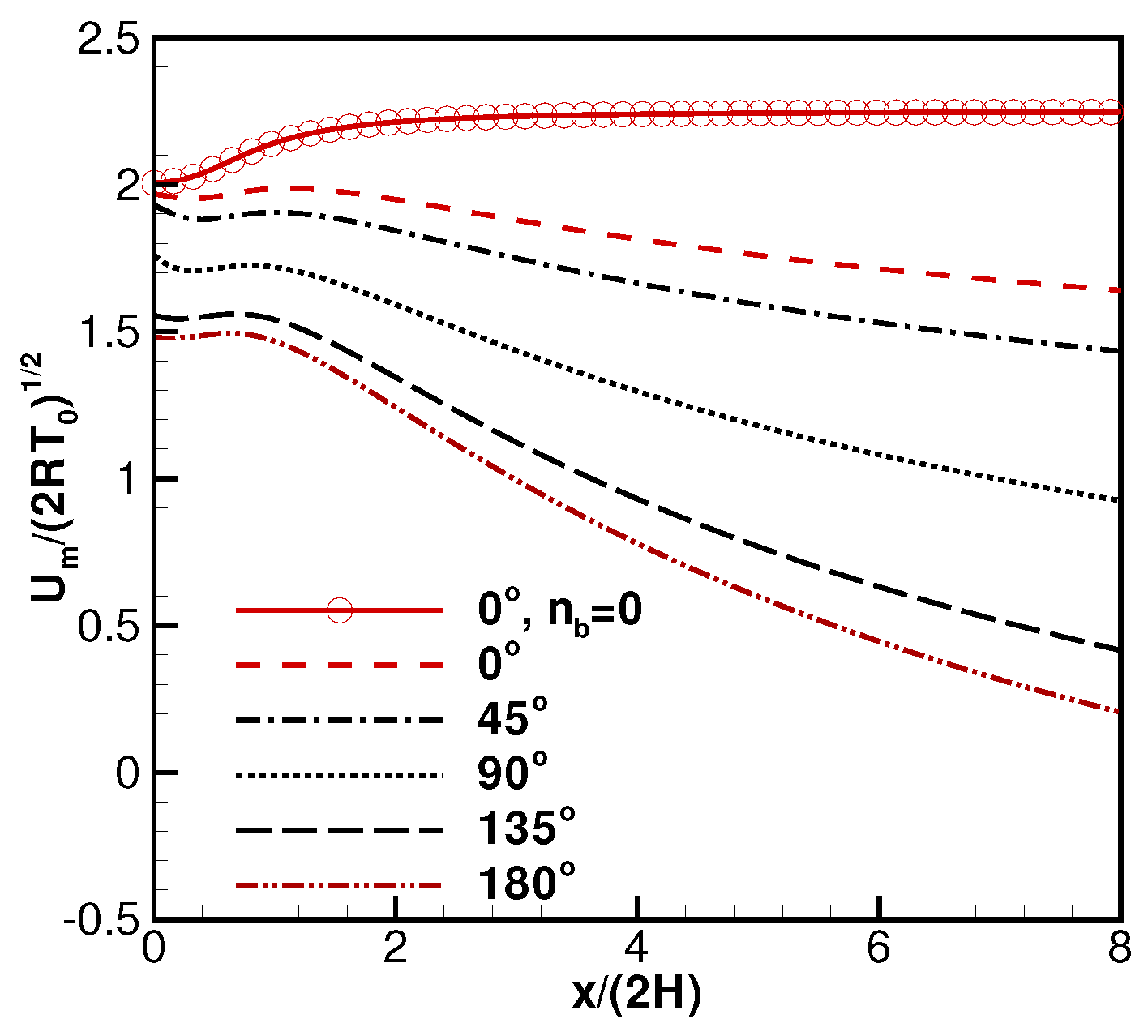 Figure 8, Figure 9, Figure 10 and Figure 11 present several jet centerline properties, calculated with Equations (7), (8), (10) and (11). The parameters are: , , , Kelvin, and Kelvin, and the background flow direction varies to demonstrate the background flow effects on the primary jet flows. Figure 8 shows the centerline density profiles. Circular symbols are added on the pure jet curve for clarity. For mixed flows, the scenarios of and form two bounding limits, and all the curves for mixed flows have an asymptote of at farfield. By comparison, the profile for a pure jet scenario approaches zero at farfield. This figure demonstrates that the effects from the background density shall be quantified. For example, in the upper atmosphere, the background density decreases at higher altitudes and the effects may diminish.