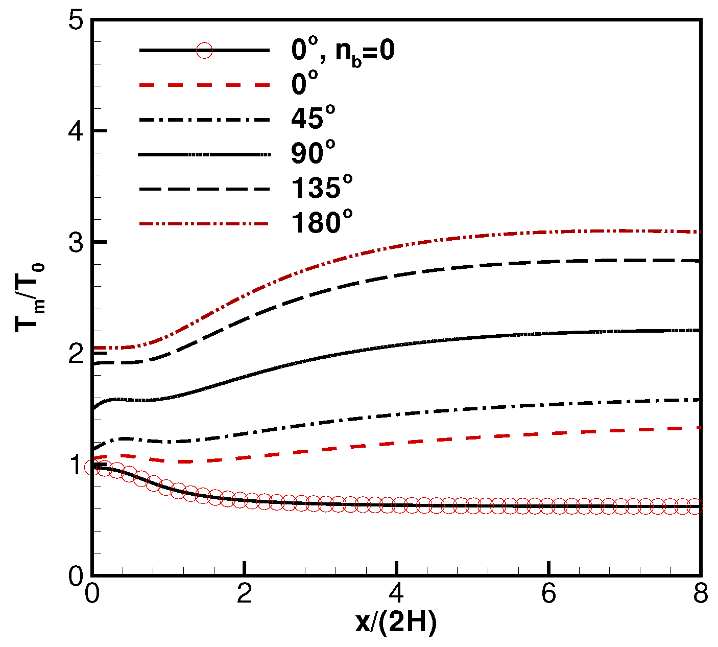 Figure 10 shows the non-dimensional centerline temperature profiles for the jet/background flow mixture. The relatively hotter background flow changes the farfield profiles. For the pure free jet situation with , at farfield, faster molecules have larger opportunities to appear and their velocity deviations from their local bulk velocities become smaller, resulting in a decreasing temperature profile. However, for mixed flows with , they must eventually merge into the hot background flow ( Kelvin Kelvin). In a ground vacuum chamber, a room temperature is proper to describe the background flows, but at upper atmosphere, the temperature is low. This figure indicates that the background flow temperature effects shall be carefully quantified.