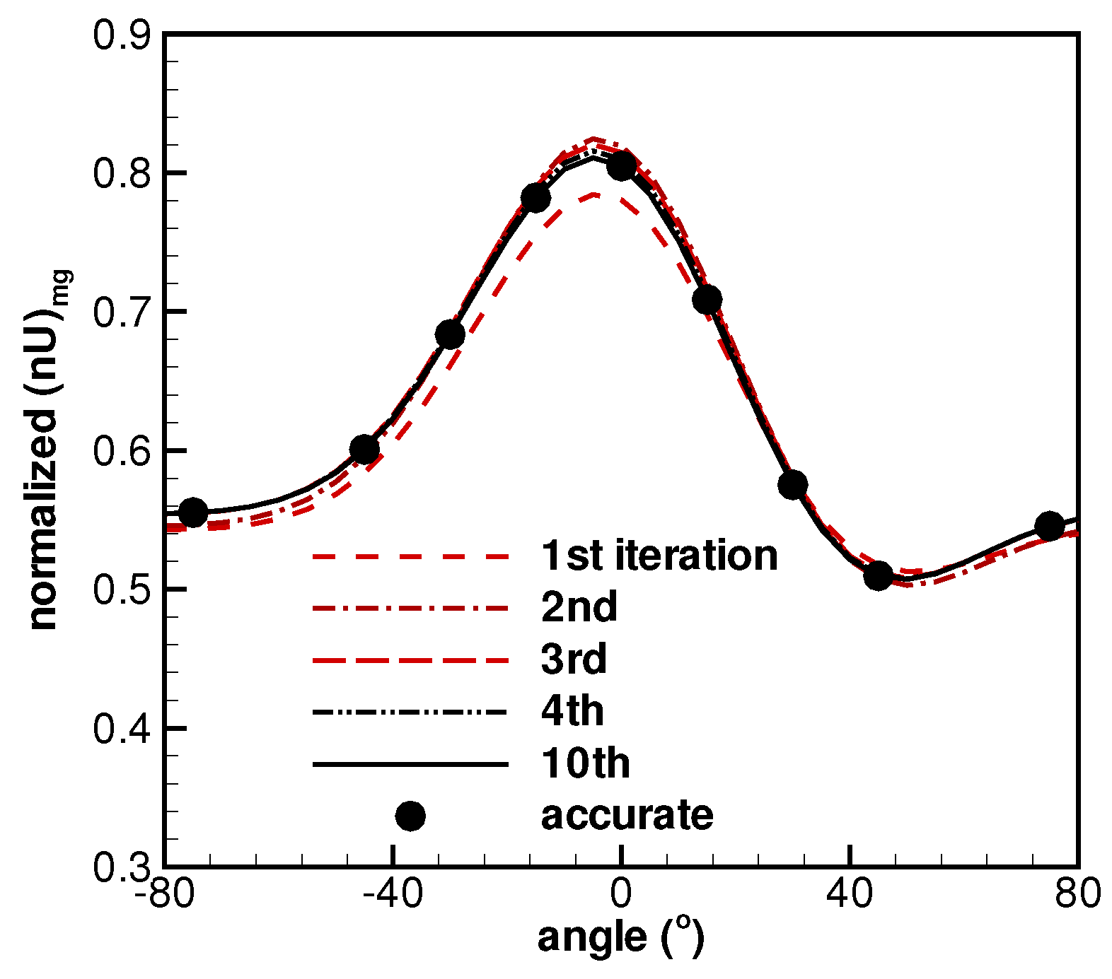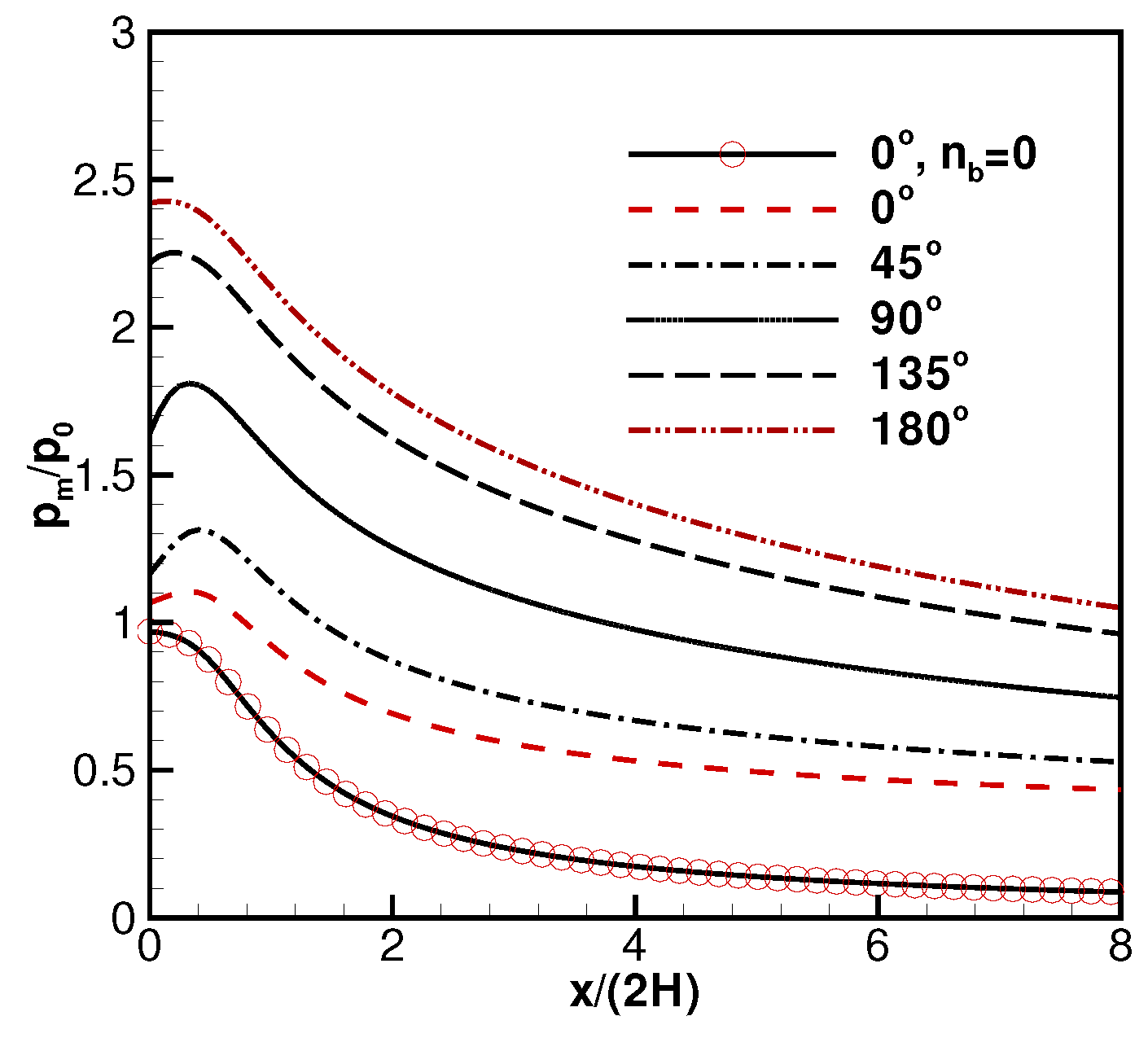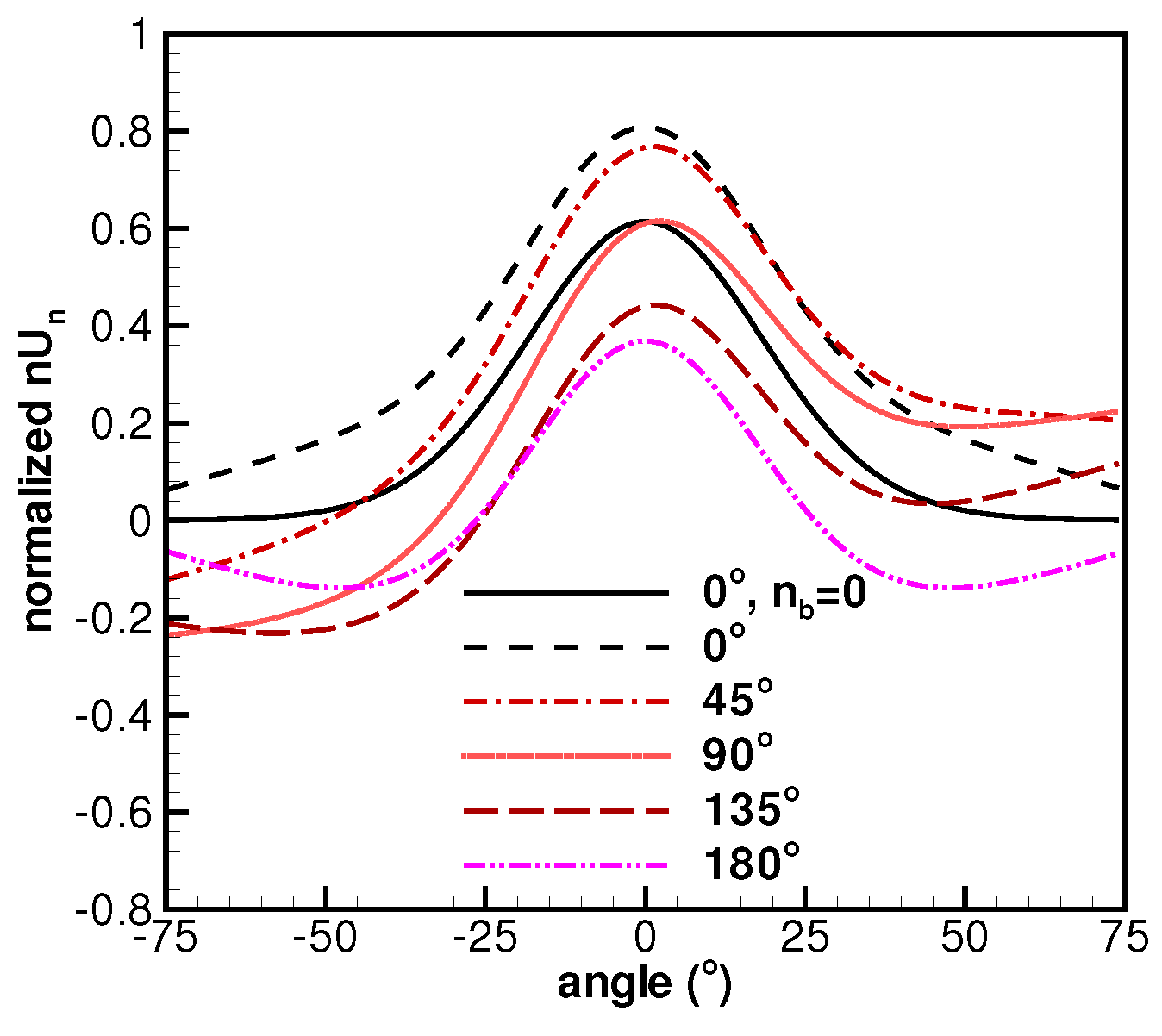 Figure 11 shows the non-dimensional centerline pressure profiles for the mixture, where the pure jet flow case () has the lowest value. With background flows, different values affect the final mixture pressure. For example, leads to a low pressure. Figure 12 shows the number flux for the mixture, along a constant radius, , and the angle span formed by the curve ends and the exit center is . All the other parameters remain the same as the above test case for the centerline profiles. For the pure jet situation without background flows, the number flux profile is symmetric. For the other test cases with background flows but different values, most number flux profiles are distorted and asymmetric. For the situations with or , the profiles are symmetric about the centerline. Figure 11 and Figure 12 can explain Yim and Burt’s conclusion [19] that different pump locations may affect the measured experimental data. Because vacuum pumps remove gas molecules and form local background flows towards the pumps, different pump locations create different local values. As can be understood, different vacuum chambers installed different types of pumps at different locations. These two figures show adverse facility or background flow effects due to different flow directions.
