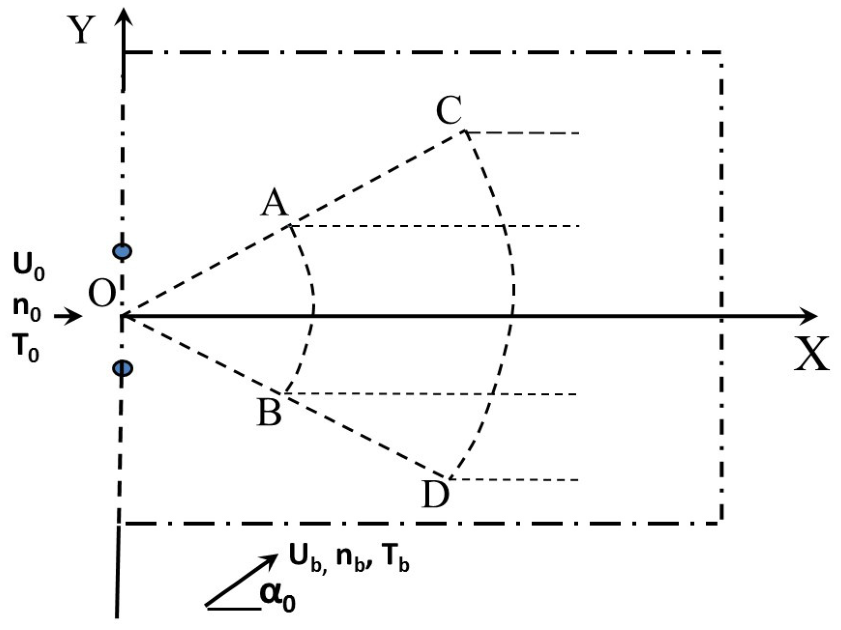 Equations (7)–(11) are complex with several non-dimensional parameters; hence, numerical evaluations and validations are necessary. A specific DSMC simulation package named GRASP [29] is adopted for the simulations. Argon gas is assumed as the rarefied jet and background flows. Figure 1 shows the boundary conditions. Line is treated as a jet exit and an inlet into the simulation domain. The rest of the simulation domain boundaries are treated as inlets for the collisionless background flow. For DSMC simulations, an inlet boundary condition means within each time step, a certain number of simulation particles are introduced into the simulation domain from that boundary, and a particle is removed from the simulation if it hits that boundary from inside. It shall be emphasized that the background particles are introduced into the domain from all the boundaries except segment —the nozzle exit blocks the background flow particles. The flow is collisionless with an infinitely large Knudsen number, and the DSMC simulations assume no collisions.
