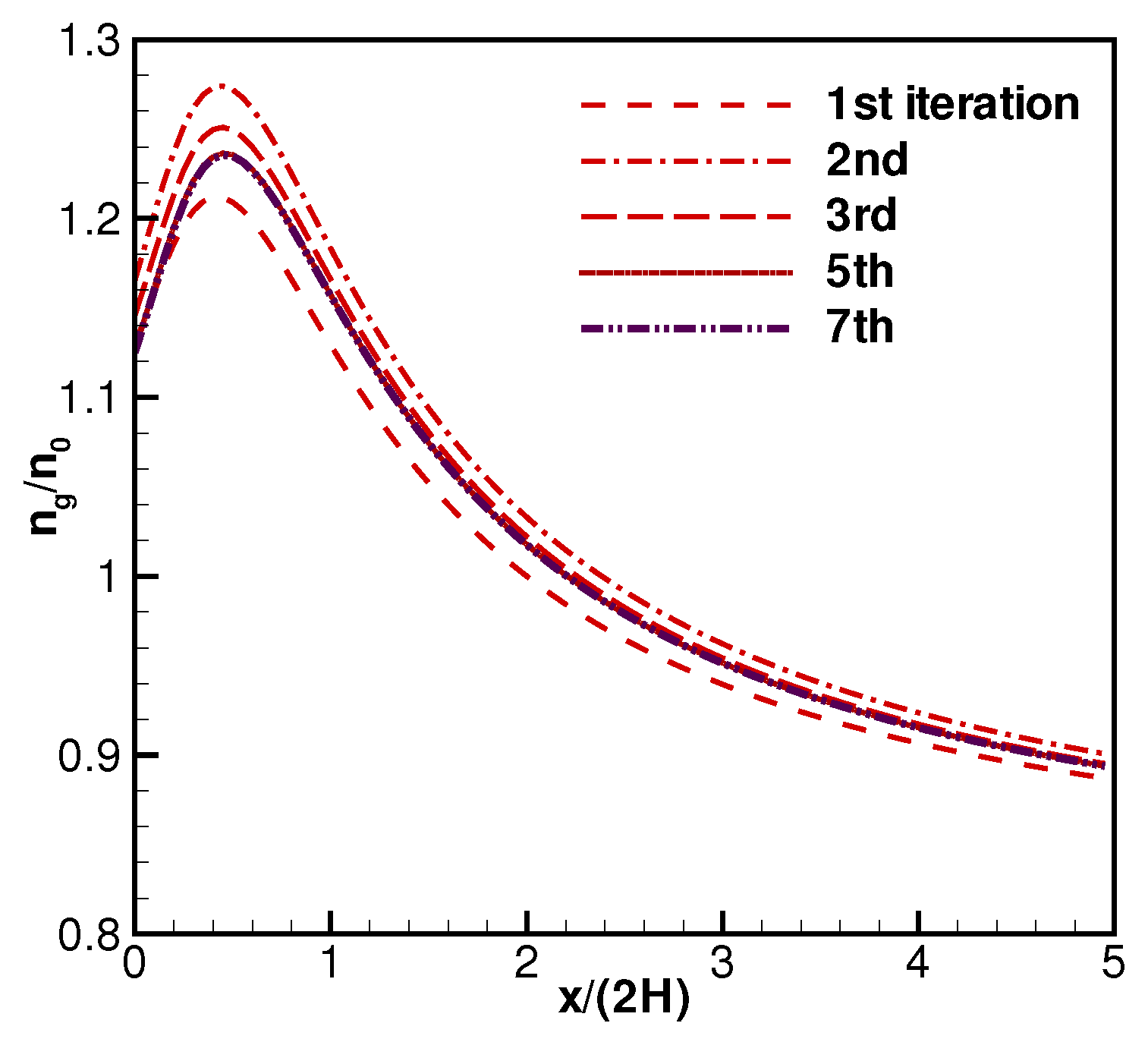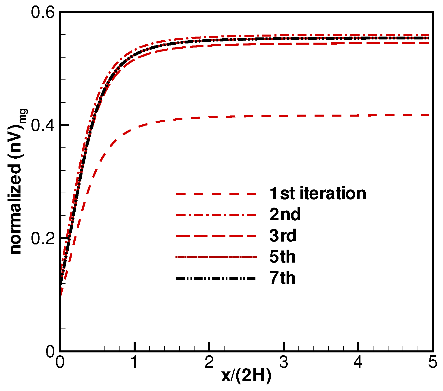 where “” is for jet property, is the specific speed ratio for the jet flow, , , , H is the semi-height of the nozzle exit, and . It shall be pointed out that, Noller [28] proposed a “starter surface” method to describe how to compute the jet density. The work in this paper is related but with significant differences. For example, the exact expression for jet density is accurately derived and presented in this paper, not in a descriptive manner. Only with this accurate formula for the density, the formulas for velocity and temperature can be further derived.