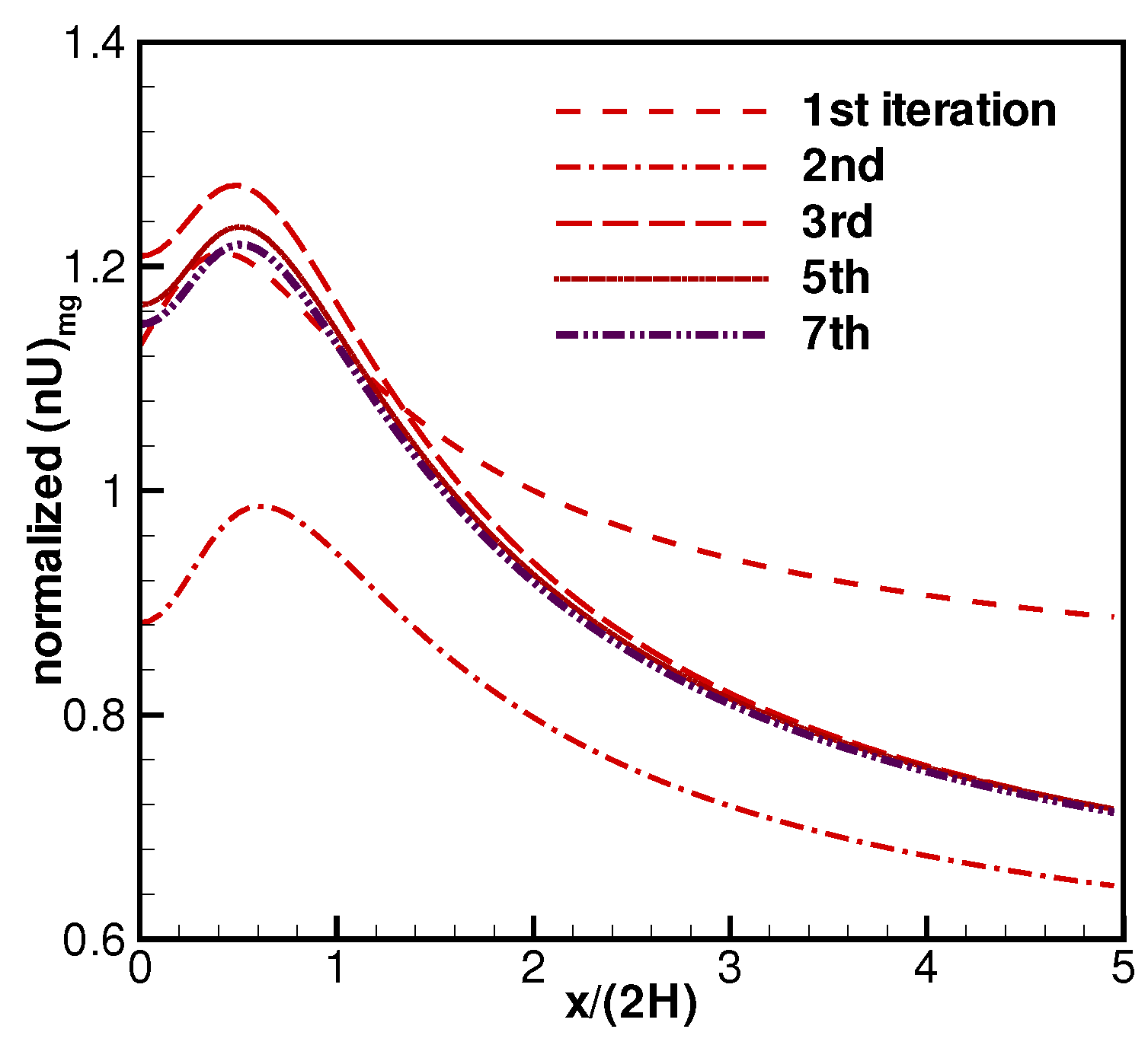 The following initial estimated parameters are assumed to start the recover procedure: , , , , , Kelvin, and Kelvin. The following properties are taken from Table 1 and assumed known: number densities at points A, C; number fluxes along the X-direction at points D, E, H; and number fluxes along the Y-directions at points H, I. These values form the right hand side terms for the seven equations: two from Equation (21), three from Equation (22), and two from Equation (23). Table 2 shows the development histories for the absolute values for the seven parameters, as shown, after fifteen iterations, the seven estimated parameters are sufficiently close to the true parameters. Table 3 shows the parameter convergence histories for , each of them is correction percentage to the values from the previous iteration. As illustrated, the differences among the guessed and true values are negligible after the fifteen iterations. Figure 15, Figure 16 and Figure 17 show the corresponding developing profiles for the jet centerline number density and number fluxes along the X- and Y-directions. Those profiles are computed with updated parameters. These three figures indicate that after three rounds of iterations, the profiles are actually close to the true profiles. At farfield, the profiles merge into the background flows. As discussed in Section 2, the background flow can distort the jet flowfield patterns significantly, or even create totally opposite trends. Figure 18, Figure 19 and Figure 20 show the corresponding profiles for the number density and number fluxes along the arc m, where the data from Table 1 are presented as solid points. As shown, the convergence develops quite fast, the differences are minor among the results obtained by using the parameters obtained after four and ten iterations. It is reasonable to conclude that by using the parameters obtained at the fifteen iterations, the whole flowfield parameters recovered accurately.