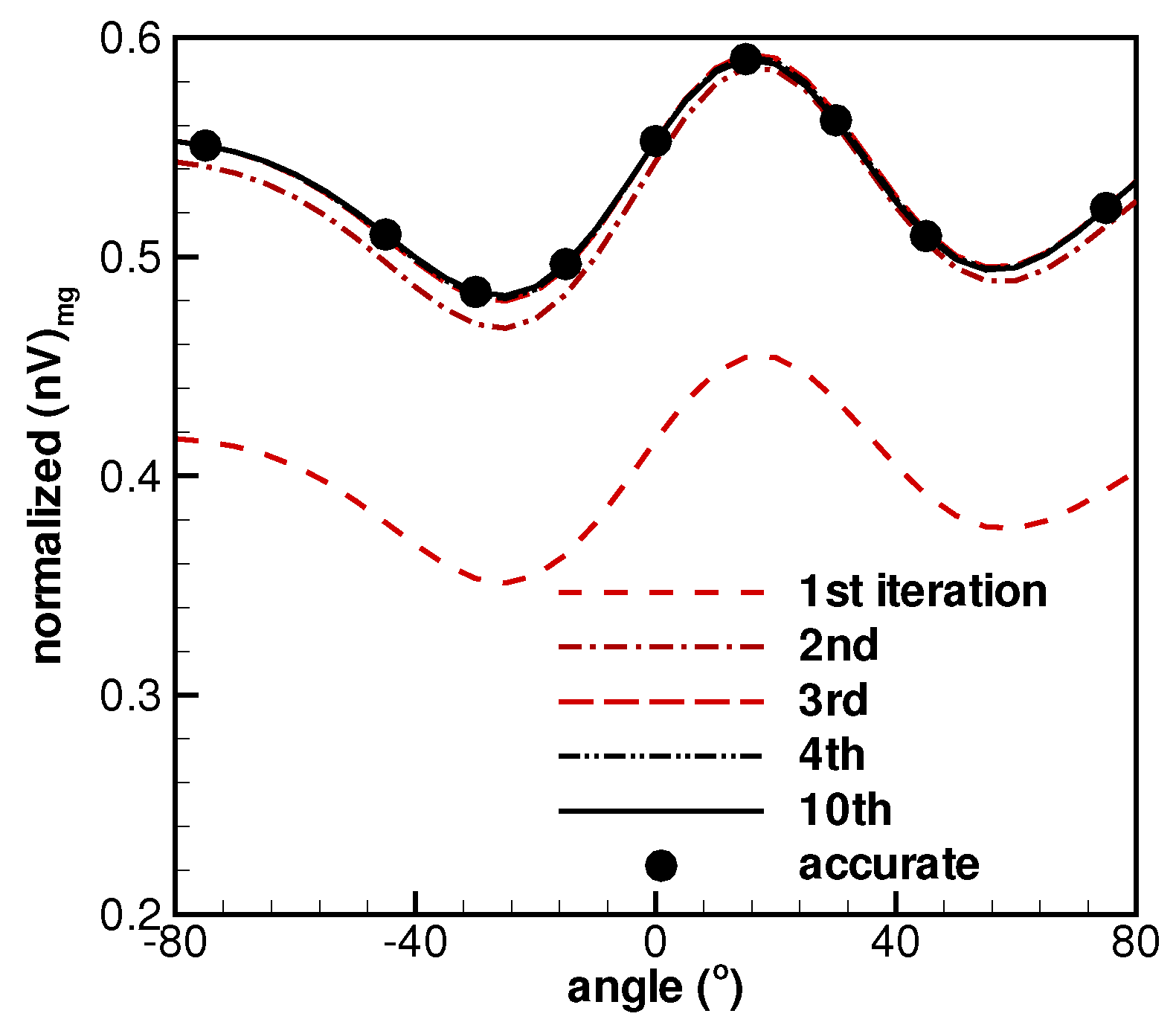 The above process is fast, because in the end, it only requires to solve seven linear algebraic equations, and the whole process may require seconds. Most time in the above procedure is spent on computing coefficients , , and . This method requires as fewer as seven measurements, and the whole flowfield can be further computed by using the seven recovered parameters for the jet and background flows. The three recovered parameters for the jet can be used to compute the pure jet flow (in a true vacuum condition) very conveniently by adopting Equations (2)–(5). It is also possible to estimate the background flow effects on the thruster by using the four recovered parameters for the background flows and Equations (13)–(19). For example, the amount of background flow may entrain or enter the thruster exit, if the exit area is available; and the extra force that the background flow may create on the devices, if the devices’ surface geometry information is available.