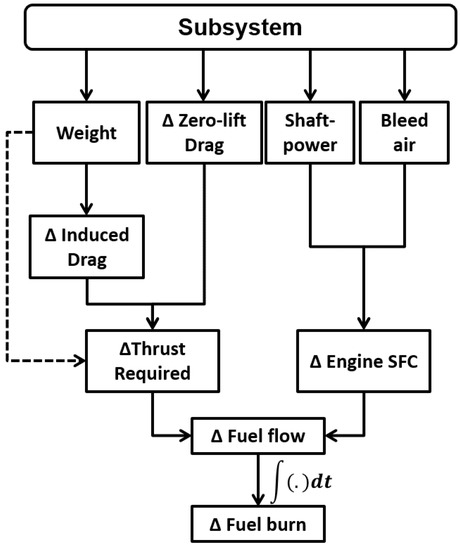 The net impact of such subsystem architecture changes on a mission-level metric such as fuel consumption occurs through multiple avenues, as shown in Figure 1. For the same mission profile, the impact of weight changes (first avenue) is to alter the induced drag (and thus, the thrust required to offset it) and also the thrust required to overcome inertia while accelerating or climbing. Similarly, changes in zero-lift drag directly affect the thrust requirement. The third and fourth avenues of Figure 1 account for changes in the non-propulsive (secondary) power consumption by the subsystem architecture. Changes in these power off-takes, either in the form of bleed air or shaft-power from the engines or Auxiliary Power Unit (APU), result in a change in the specific fuel consumption (rate of fuel consumption per unit thrust or power produced).
