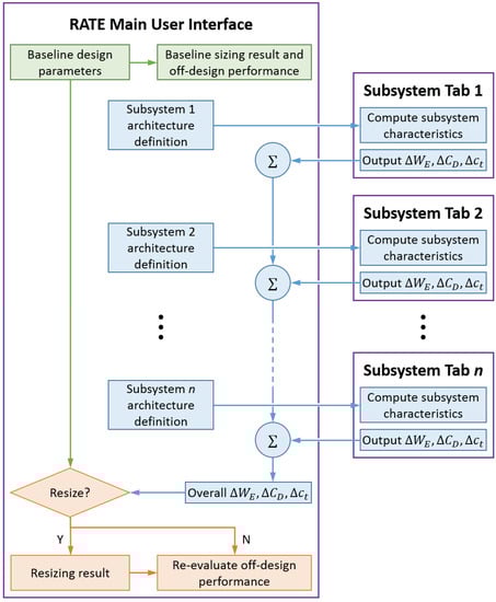 The Rapid Architecture Tradeoff Environment (RATE) was created for the system level assessment of various subsystem architectures. The environment consists of three modules which are described in the following subsections. The data flow between the modules is illustrated in Figure 2. The main user interface of RATE (Figure 3) is primarily built in Microsoft Excel, where the analyst specifies the aircraft point performance and mission performance requirements and also parametrically defines one or more subsystem architectures to be analyzed. The function of the subsystem tabs is to perform a physics-based sizing of relevant subsystem components and determine changes in aircraft empty weight, parasite drag, and engine thrust-specific fuel consumption arising due to the subsystems. The net impact of these effects on the aircraft’s performance for both design and off-design missions is then ascertained. RATE also offers the option to re-size the aircraft in response to subsystem-driven impacts. The three main modules of RATE are described in the following section.