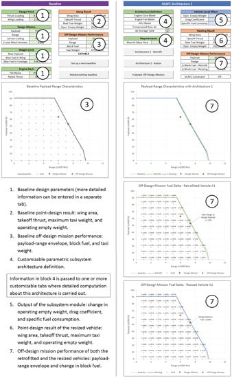 - Scenario 2: The vehicle may be assumed to be resized, for the same design mission as with the baseline, using the same sizing method except that the weight buildup relationships, the drag coefficient, and the specific fuel consumption are modified according to the output from the subsystem analysis module (Module # 2). The resized vehicle maintains the same takeoff thrust-to-weight ratio, takeoff wing loading, design payload weight, design range, and maximum payload weight. However, depending on the subsystem impacts, the operating empty weight, the maximum takeoff weight, the wing area, the sea-level static thrust, and the maximum fuel capacity may be different from those of the conventional baseline. Off-design mission analysis is performed similar to that in the retrofit scenario, and the outputs include an updated payload-range envelope, and updated fuel consumption, takeoff gross weight, and change in fuel required at each specified off-design mission.