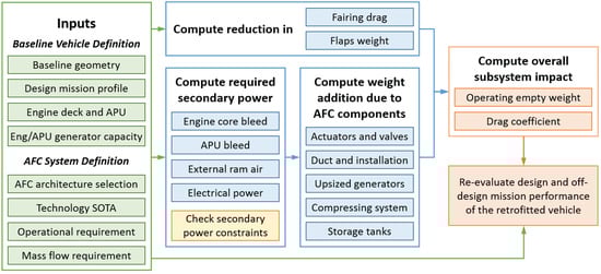 Computation of the subsystem characteristics as described above is subsystem-specific, and may be carried out either in Excel or using other tools which can be interfaced through a data link with Excel. The assessment of HLAFC architectures in the current work uses a combination of the above. The subsystem characteristics are mainly computed in Excel, while sizing of certain components that require time-domain simulation is performed using MATLAB scripts (The Mathworks, Inc., Natik, MA, USA) which are called by Excel through Visual Basic for Applications (VBA) using Spreadsheet Link. Detailed HLAFC subsystem analysis flow is presented subsequently in Section 3.
