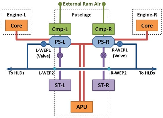 The high mass flow rates predicted in previous works [,] pose another significant challenge in that they are beyond the bleed supply capabilities of the main engines and the APU. This work, therefore, considers external ram air as an additional air supply source, and shaft-power extraction (as opposed to only bleed air extraction) as an additional secondary power source. In fact, large enough system mass flow requirements may necessitate the use of multiple air supply sources and secondary power types. This leads to multiple architecture possibilities for the HLAFC system, of which this work considers four.