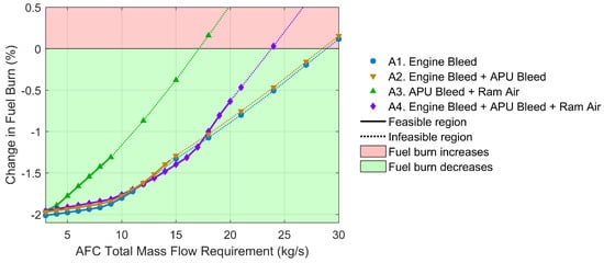 In this work, four different HLAFC architectures (A1–A4) are considered and summarized in Table 2. A1 uses engine core bleed exclusively, while A2 adds the full bleed capability of the APU. A3 uses APU bleed but not engine core bleed, and electrically compressed external ram air . Finally, A4 uses all the three possibilities for supplying the HLAFC system. For architectures where the APU and ram air are used simultaneously (A3 and A4), only APU bleed air off-take is considered and not APU shaft-power off-take.