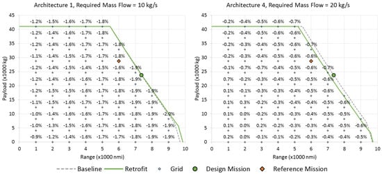 Payload-range characteristics and change in block fuel of two HLAFC architectures at different mass flow rates.