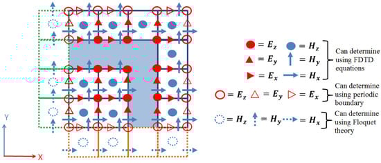 The magnetic field components do not exist in the problem space. Using the Floquet theory, can be calculated as in Equation (11). is the wave number in the direction and can be computed as ( is the incident angle of the wave in the direction):