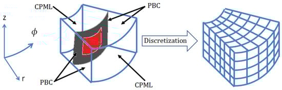 Equation (4) is for calculating the field components at the lower bound of ϕ (). The field components are computed using and the magnetic field components in the z and ϕ directions, which are , , and . The magnetic field components are at . The updating coefficients , and of Equation (4) can be computed using Equation (A2).