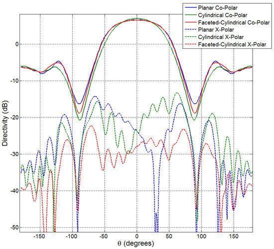 It is interesting to compare the results from the planar and the cylindrical/facet array since they have the same radiating elements and the same (projected) planar aperture size. For the planar array, the focused array beam pattern has the sidelobes and cross-polarization levels below −18 dB and −27 dB, respectively. Comparing Figure 13 and Figure 15, in the principal planes, the faceted-cylindrical array patterns have lower cross-polarizations in some directions, while the radiation pattern of the cylindrical array has some higher sidelobes at and locations, which is mainly due to the surface curvature [25]. Associated EM simulations show that with the increased size of the diameter, the sidelobe levels at and locations decrease, while the cross-polarized power levels around broadside directions are not much affected.