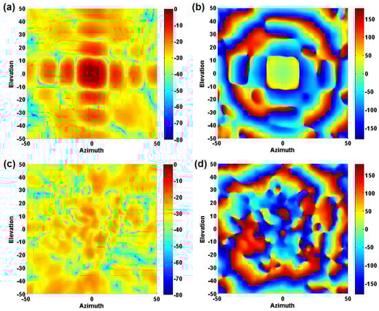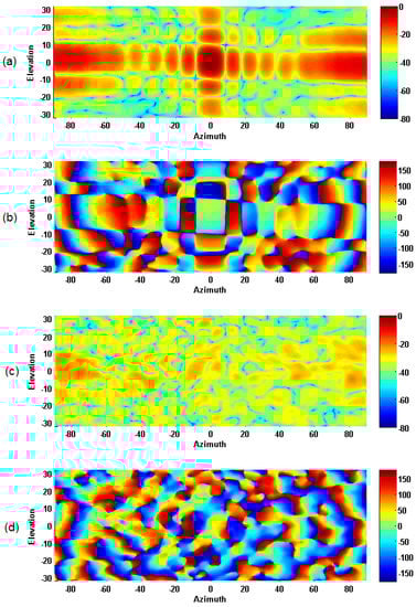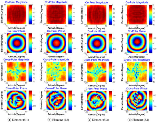 is the calibration value for each element. This value can be measured with a proper test procedure. In this work, the mean value () of a small zone ( data points) at the center of the co-polarization phase pattern is processed in each element to compute the calibration matrix: .