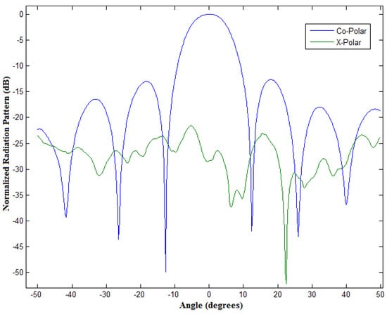 The azimuth principal plane cut of measured co-polar and cross-polar patterns of an eight-by-eight planar phased array antenna (based on AEPs and software calibration).
