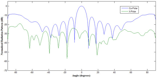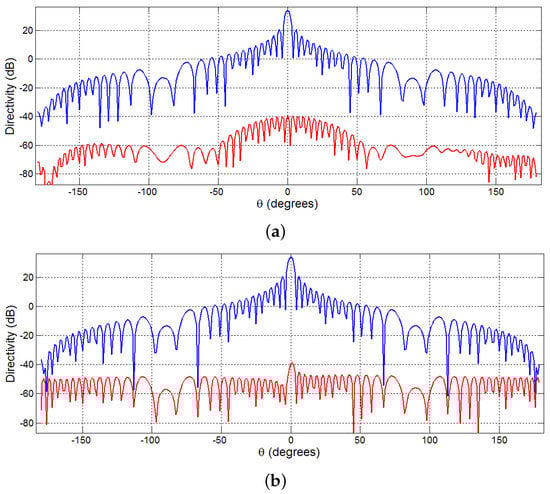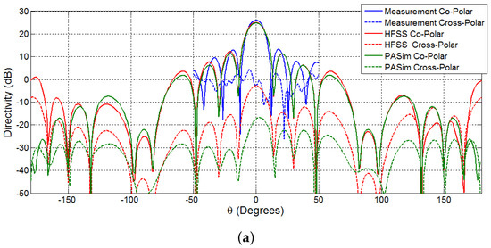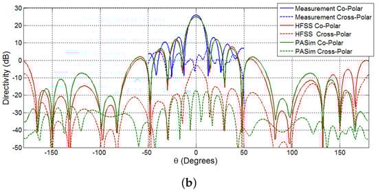 Principal plane cut of 32-by-32 array simulations using the PASim program. The blue and red plots are respectively co-polar and cross-polar directivity patterns of each principal plans. (a) Horizontal principal plane cut; (b) Vertical principal plane cut.