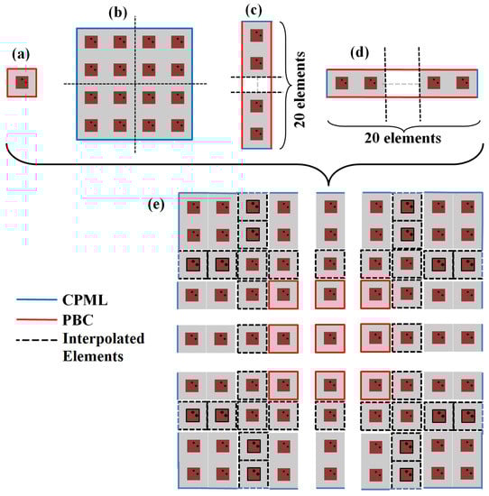 Given a radiating element design, an approach is developed that can merge the near-field patterns of smaller subarrays to arbitrarily-sized large arrays and achieve a good compromise between computational loads and full-wave accuracies. Within the FDTD time marching loop, the electric and magnetic current densities on the designated imaginary surface are collected in the first step, which is used to calculate the near-field to far-field transformation. The frequency domain or time domain current densities can also be collected. For the proposed procedure herein, the frequency domain current values are used for the near-field to far-field transformation calculations. Four separate simulations are performed firstly as the building blocks, and they are illustrated, in Figure 16a–d. The first building block is an active element in an infinite array (infinite-by-infinite array with periodicities in both the and directions). The second and third are semi-infinite arrays (20-by-infinite array with the periodicity in the direction and infinite-by-20 array, which periodically repeats in the direction). The fourth building block is a finite array (four-by-four). These four simulations can be done simultaneously using four cores of a computer. For each of the simulation runs, the current densities in the frequency domain are collected at strategic locations. For example, in the simulation illustrated by the array (a) in Figure 16, current densities on the surfaces in the and directions are collected. The edges of a large array are constructed with the array simulation illustrated with the array (b) and the array (c) in Figure 16. The current distribution on surfaces in the and directions is gathered for the first two and the last two elements of both arrays in the frequency domain. The 20-by-infinite building block has CPMLs in the and directions, and the infinite-by-20 building block has CPMLs in the and directions. These current densities are used to merge and combine the near-field samples (current density components) of a large finite array. During the merging process, the current distributions over the entire surface of the large finite array are re-constructed based on the current densities collected from the building blocks. In addition, the current distributions on the surfaces next to the periodic boundaries are discarded, and the current distributions on the surfaces next to the CPML are used.