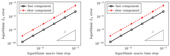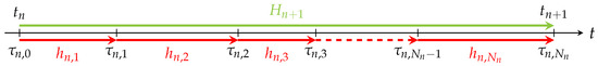 Thus, one step of an MGARK scheme includes one macro step of step size H as well as all of the N micro steps having potentially different step sizes . In order to apply the order theory for GARK schemes as in Theorem 1 to MGARK schemes, we would like to reformulate the MGARK method as a GARK scheme using separate stage values for fast and slow components as in Definition 3. As the classical form of GARK schemes depends on constant micro step sizes within one macro step, the step size of the micro steps will be denoted by using the coefficients . Substituting these step sizes into Equations (9)–(11) and considering the coefficients as modifications to the Runge-Kutta coefficients , and , we obtain