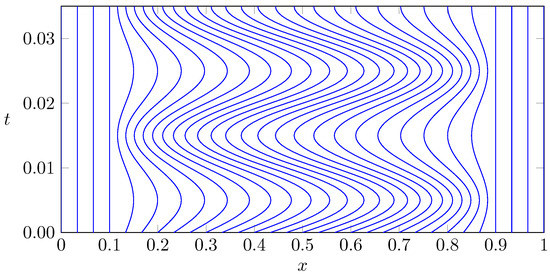 with the parameters and . The grid cells are then determined from the grid points according to . Hence, in this set-up the grid points with are fixed while the grid points with oscillate in form of a sine wave in time with frequency ω. The choice of the amplitude according to Equation (81) guarantees that the grid cells do not overlap, i.e., for all , we have . Figure 3 depicts the corresponding grid motion for an equidistant initial grid with cells, a frequency of and a confined region of grid movement bounded by , .