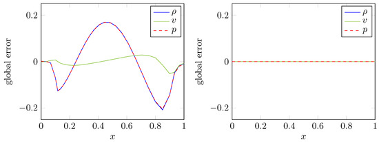 In order to illustrate the importance of calculating mesh velocities which are consistent with the GCL, Figure 4 depicts the error with respect to density, velocity and pressure of the explicit Euler scheme applied to the fluid equations. More precisely, the right hand side of Figure 4 shows the result for mesh velocities computed according to Equations (59) and (60) while the left hand side depicts the corresponding errors obtained by grid velocities determined from differentiation of Equations (80) and (81) with respect to t. In the first case the constant initial state is preserved in accordance with the theoretical considerations while the second case does not lead to a numerical method consistent with the GCL.