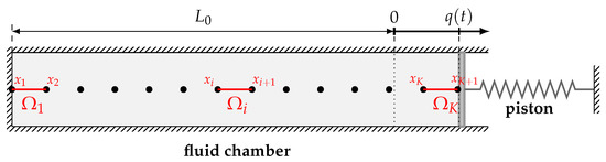 The interaction between a piston which is attached to a spring and an inviscid fluid which is contained in a chamber is a classical test case in the context of fluid–structure interaction [33,34]. The coupled piston problem and its one-dimensional set-up are illustrated in Figure 6.