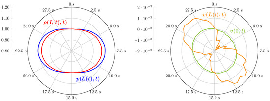 for interior grid cells, using a suitable numerical flux function . At the two boundaries of given by the grid points and , boundary conditions are required. As there is no movement of fluid particles through the boundaries of the fluid chamber (no-slip conditions), we demand that at the boundaries, the fluid moves with the same velocity as the corresponding boundary grid point. Suitable boundary conditions may be posed either as strong or as weak boundary conditions. Strong boundary conditions usually modify the numerical solution in a suitable way in order to satisfy the no-slip conditions. Weak boundary conditions usually modify the numerical flux in a suitable way. In comparison to strong boundary conditions, weak boundary conditions often lead to an improved convergence speed regarding iterative solvers and may also lead to an improved robustness, see [35,36,37]. Concerning weak boundary conditions, both weak prescribed and weak Riemann approaches are common. In this work, we use the weak prescribed approach, i.e., the boundary fluxes are explicitly prescribed according to