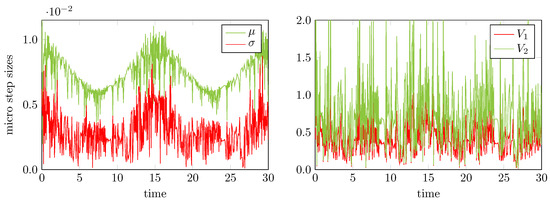 Now we would like to pay more attention to our strategy to allow for adaptive non-constant micro step sizes within one macro step. In this regard, Figure 9 collects the statistics of the computed macro and micro step sizes. For the micro step sizes, the left part of Figure 9 shows the time evolution of the mean value μ and the standard deviation σ calculated as