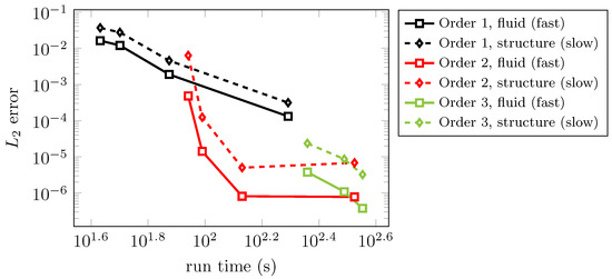 A spatial discretization of 100 FV cells and a final time of has been used in all test cases. The computations were carried out for different macro step sizes. During each computation, the macro step size was held constant while the micro step sizes were chosen with respect to the Courant-Friedrichs-Lewy (CFL) condition, with a CFL-number of , i.e., according the error-controlled approach described in Section 3.4. In order to compute the numerical error depicted in Figure 10, a reference solution was calculated using the 3rd order explicit IMEXRKCB3c scheme to solve the fluid–structure system as a whole in a monolithic manner with a suitably small time step size and without the use of different step sizes for the subsystems.