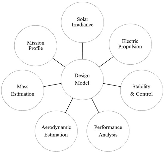 Several major design parameters are considered when designing a solar-powered UAV. As defined in a previous study [16], the parameters (see Figure 1) include aerodynamics, performance, stability and control, mass estimation, solar irradiance amount, mission profile, and electric propulsion systems [18].
