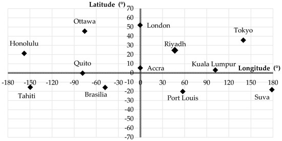 This study is divided into two phases. Phase One simulates the suitable design specifically for a year-round flight for 12 selected cities. Figure 2 shows that the 12 cities, namely, Ottawa (Canada), Honolulu (Hawaii), Quito (Ecuador), Tahiti (French Polynesia), Brasilia (Brazil), London (United Kingdom), Riyadh (Saudi Arabia), Tokyo (Japan), Kuala Lumpur (Malaysia), Accra (Ghana), Port Louis (Mauritius), and Suva (Fiji), cover a wide range of latitude.