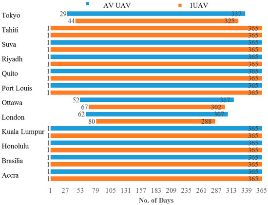 Figure 4 illustrates the endurance of the proposed AVUAV and 1UAV for each city. Figure 3 shows that the AVUAV proposed for London, Ottawa, and Tokyo had the highest endurance in the middle of the year, compared with other cities. The AVUAV designs for Port Louis, Tahiti, Brasilia, and Suva encountered the lowest endurances during the middle of the year and a higher endurance during the beginning and end of the year. The AVUAV proposed for Accra, Kuala Lumpur, and Quito experienced average endurance throughout the year.
