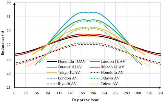 The different endurance performances of AVUAV in various cities correlate to the hemispheres of the earth. Cities in the northern hemisphere experience high endurance in the middle of the year, whereas cities in the southern hemisphere exhibit an opposite behavior. Nevertheless, all cities exceed 24 h endurance for the entire year, except for northern hemisphere cities, such as London, Ottawa, and Tokyo, which exceed the 24 h endurance threshold for only a certain period.
