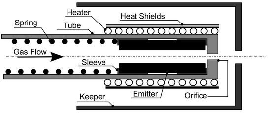 The cathode design features the same basic components as conventional thermionic hollow cathodes (Figure 1). The active electron emitter is a lanthanum hexaboride (LaB6) hollow cylinder, located inside a refractory metal tube and pushed against an orifice by means of a tungsten spring. The direct contact of the LaB6 insert with the refractory metal tube is prevented by means of graphite sleeves. An electrode denoted as keeper encapsulates the internal elements, and is made from refractory metals, titanium alloy, or graphite. The cathode can be provided with a heater, which is wrapped around the tube to raise the emitter temperature to thermionic emission values. The heater is made of a tungsten/rhenium filament electrically isolated by the tube by means of a boron nitride insulator, and is immersed in a ceramic potting. Tantalum heat shields are wrapped around the heater to improve the thermal behavior of the cathode, through a reduction of the power radiated towards the keeper. The function of the heater is to reduce the emitter thermal stress at the cathode start-up and to ease the thermionic electron emission from the emitter prior to each ignition, due to an increased surface temperature. The cathode is assembled by means of screws, which allow for rapid modifications in the cathode configuration, i.e., the inclusion of a heater or the replacement of the orifice plate. The geometrical features of the cathodes described in the following sections are not specified due to property rights.