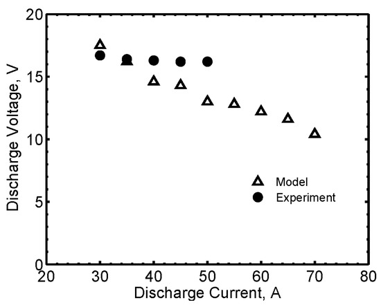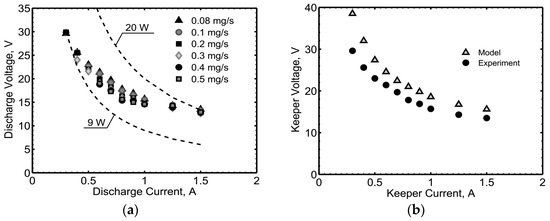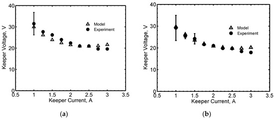 As regards the electrical characteristics, the comparison of pre-endurance and post-endurance keeper voltage is shown in Figure 10a, at 2 A keeper current and 1 mg/s Xe, with the corresponding anode voltage reported in Figure 10b. The error bars shown in the figures reflect the standard deviation found in the collected data, including an error of ±2% associated with the DC voltage measurements (some markers in the graphs hide the error bars). The comparison of the keeper voltage shows a difference of 1–4 V between the pre-endurance and the post-endurance values. At anode currents below 2 A, the anode voltage increased and the cathode tended to cool off, likely due to an insufficient ion-bombardment self-heating. The oscillations of the anode voltage as a function of the anode current likely correspond to mode changes [17,18]. HC20 was also tested with krypton, with similar trends in the electrical characteristics with respect to xenon, as shown in Figure 11. Representative comparisons are reported in Figure 12, where the results of the theoretical model are compared with the experimental data, showing a good agreement of the electrical characteristics, both in the voltage values and in the general trends with the current. The pre-endurance keeper voltage is compared with the corresponding numerical results in Figure 12a, as a function of the anode current, at 2 A keeper current and 1 mg/s Xe. The maximum discrepancy is about 3 V, and the model proved to predict the keeper voltage values with a difference lower than 20%. A very good agreement between theoretical and experimental results was found for the cathode operating with krypton propellant, as shown in the comparison reported in Figure 12b.