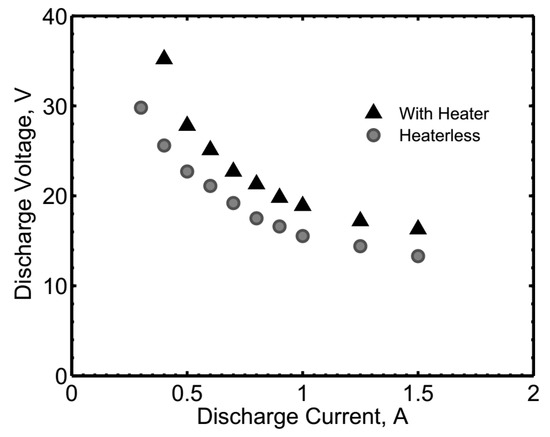 In its heaterless configuration, the cathode was ignited by combining 950 V of keeper voltage and an anode voltage comprised between 250 and 500 V, with a mass flow rate between 1 and 2 mg/s. The keeper current was limited to 1.5 A. In the case where a heater was included, a heater power of about 50 W was delivered to the cathode, before applying the keeper voltage.