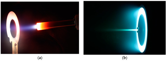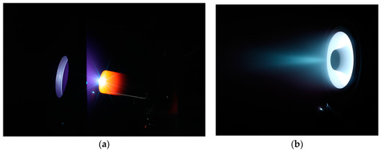 HC60 during operation: (a) With 10 A keeper current, 38 A anode current, 3 mg/s Xe; (b) Coupled with the thruster HT20k, operating with xenon.